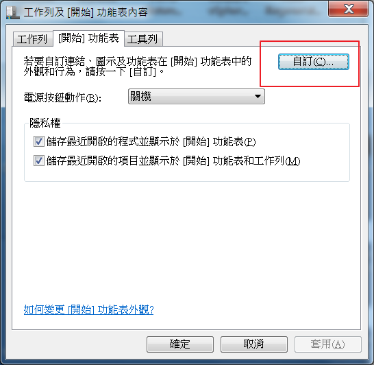 2.於”工作列及開始功能表內容” 點擊”自訂”