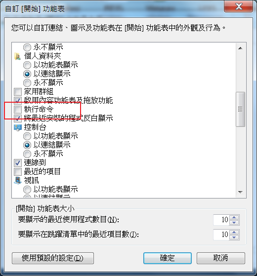3 於”自訂開始功能表” 內找到”執行命令”這個功能,然後將它選取.